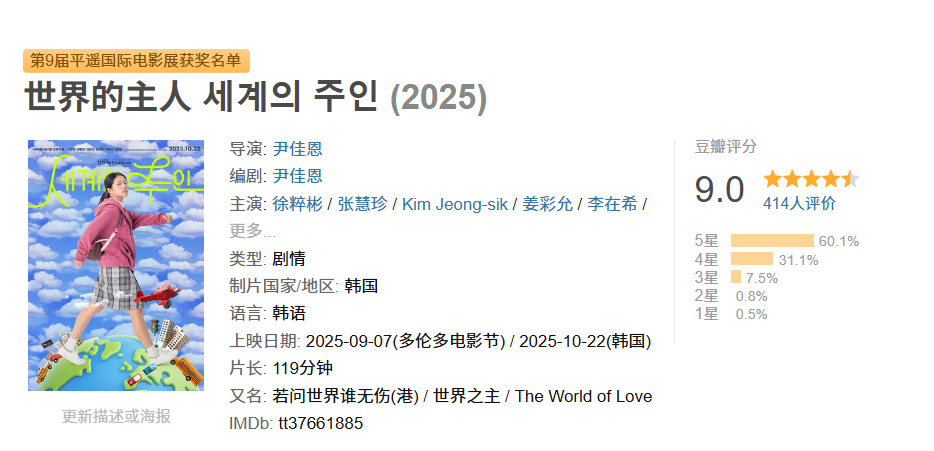 豆瓣开分9.0,该片将于10月22日在韩国上映。