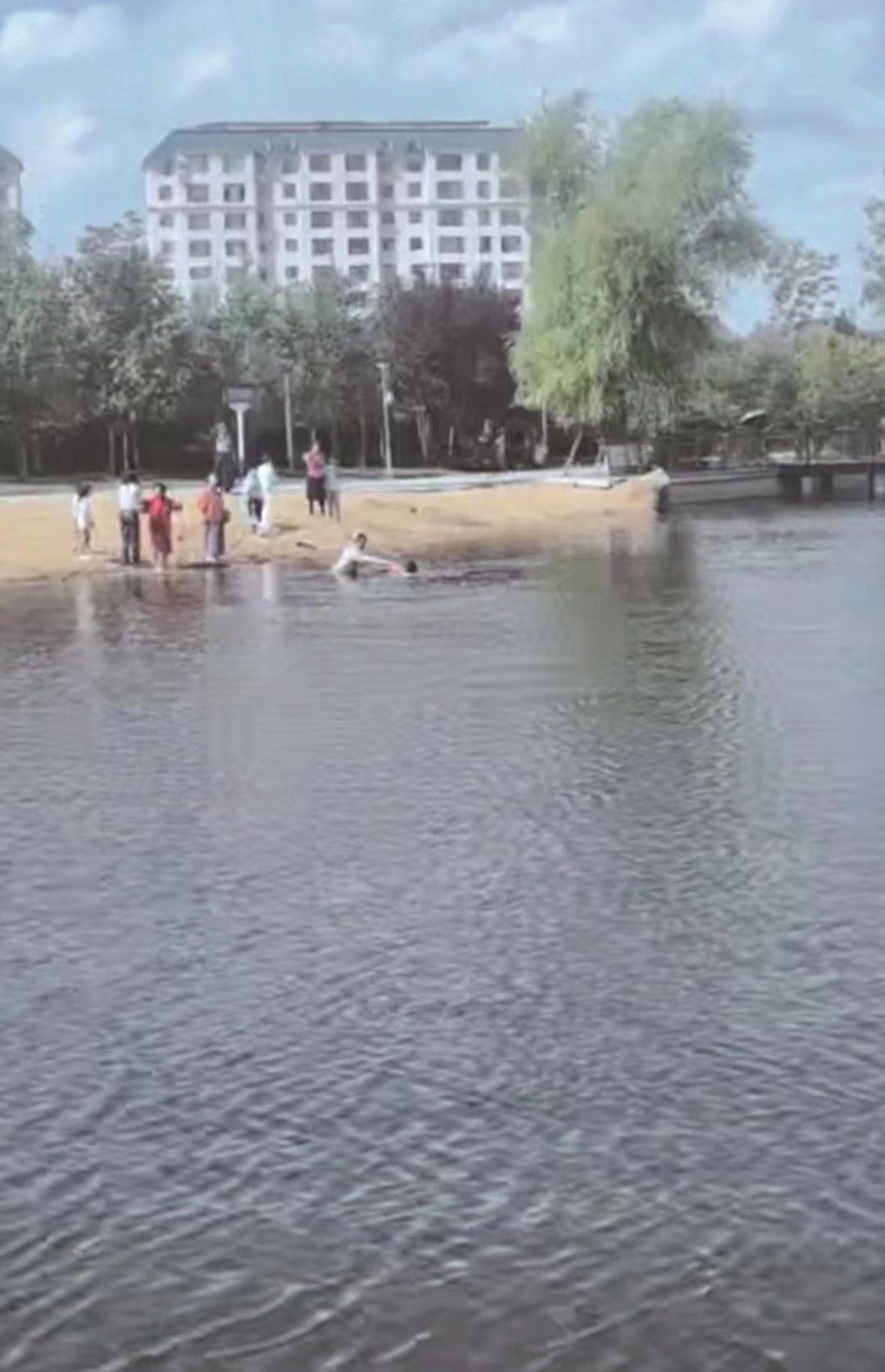 梁正强跳进湖中,快速向男孩方向游去,此时岸边不断传出哭喊声,梁正强的朋友也在安慰家属,“来了,马上就来了!”梁正强说,他在水中又游了几十米后终于靠近男孩,但此时男孩已经基本上不挣扎了,处于漂浮状态,脸部朝下,应该是已经溺水。
