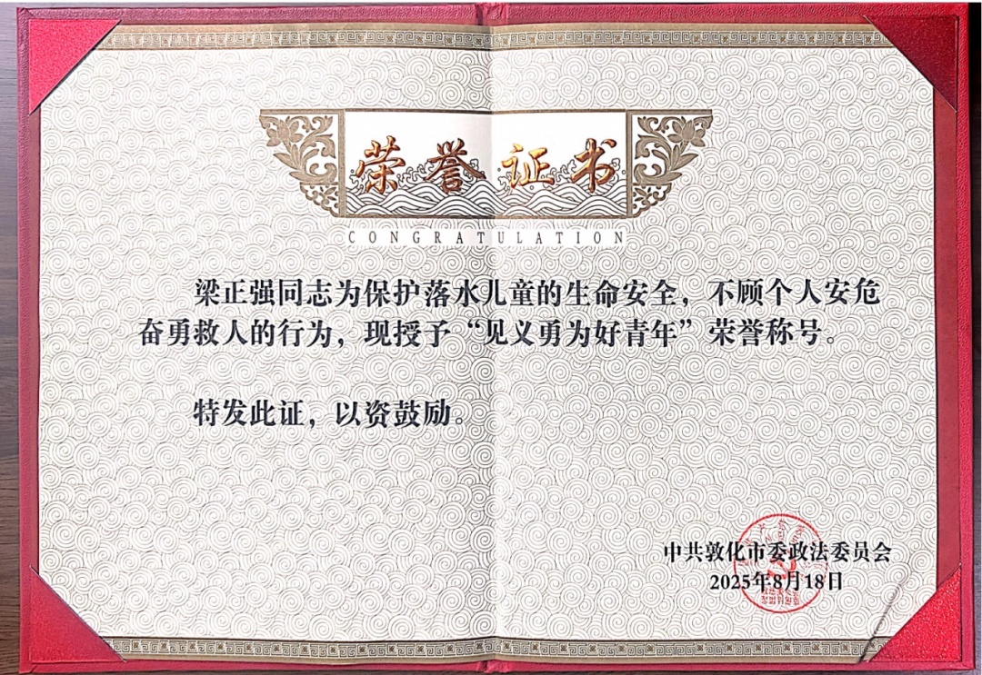 近日,一则“小伙在敦化勇救落水儿童”的视频在网上引发广泛关注,视频中小伙行动迅速,在水中游了数十米后将落水男孩成功救起红腾网,而自己由于用力过猛上岸后也瘫倒在地上。视频也被网友们纷纷点赞:“老铁好样的!”“小伙真帅!”视频中的小伙正是在深圳市臻爱艺境婚礼艺术中心工作的青年梁正强。事后,梁正强的救人行为被广泛称赞,敦化市委、市政府为他送上锦旗和荣誉证书。
